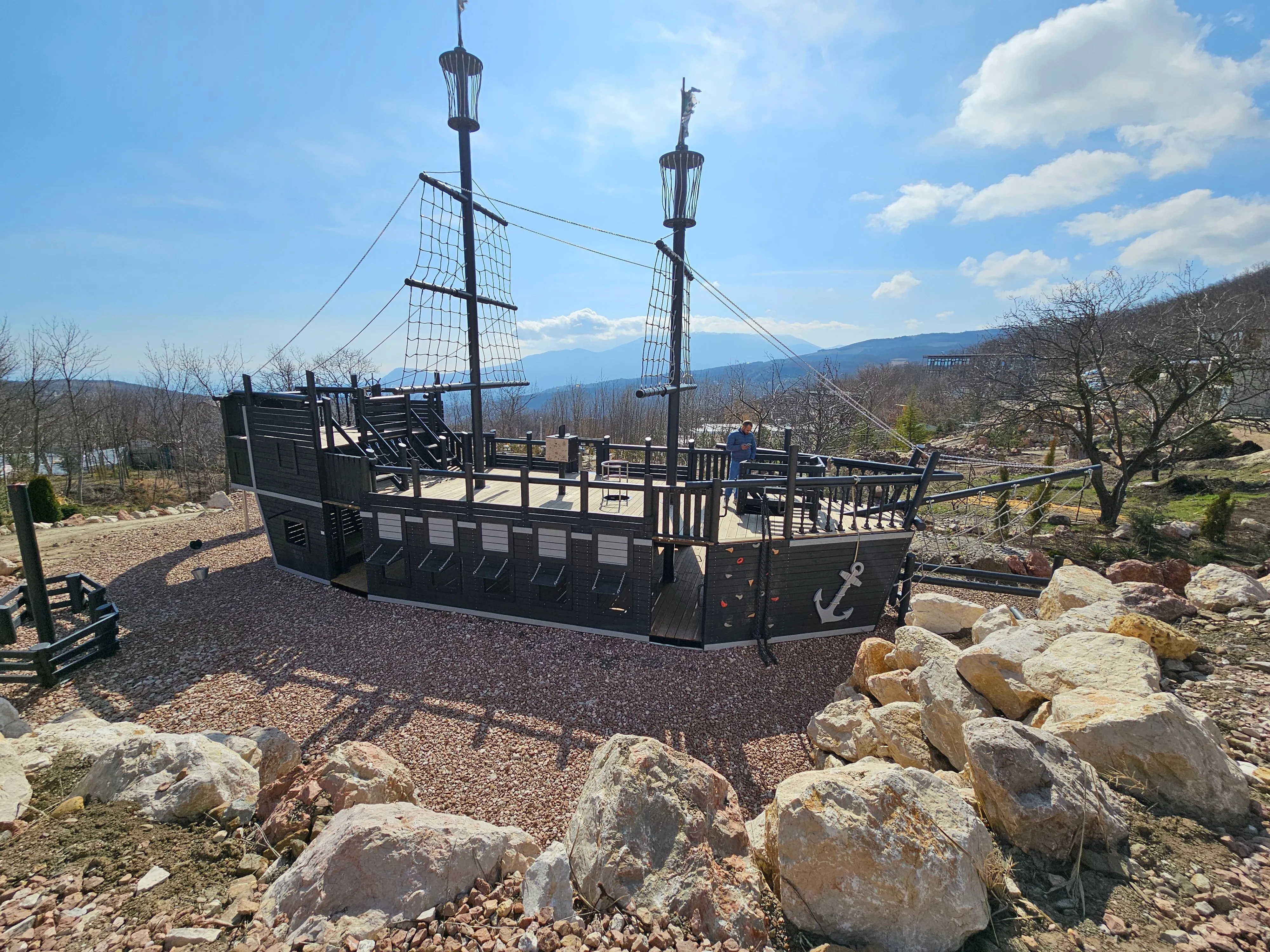 Новая необычная детская площадка «Черная жемчужина» расположилась в Крыму в Алуште, с. Лучистое. Многофункциональная площадка в виде пиратского корабля включила в себя самые разнообразные игровые элементы. Корабль совмещает в себе горку и альпинистские стенки, элементы для лазания и интерактивные элементы. Площадка имеет изгородь из каменных валунов, что позволяет более реалистично представлять самые смелые путешествие на пиратском корабле.