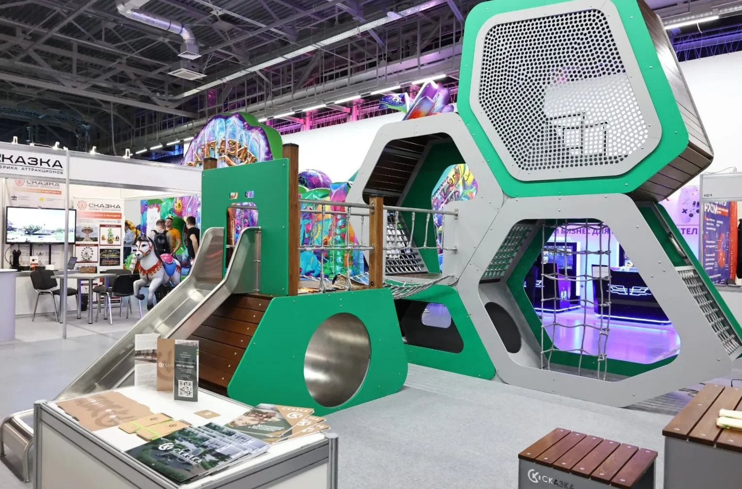 Наша компания приняла участие в XXV Международной выставке «Аттракционы и развлекательное оборудование РАППА ЭКСПО-2023», которая проходила в г. Москва, ВДНХ. На выставке был представлен игровой комплекс, выполненный из современных материалов, таких как HDPE-пластик, нержавеющая сталь, монолитный поликарбонат, перфорированный металл в сочетании с натуральной термообработанной древесиной. Так же были представлены элементы эргономичной уличной мебели из натуральных материалов. Организаторы выставки отметили нашу команду дипломом за лучший стенд.
